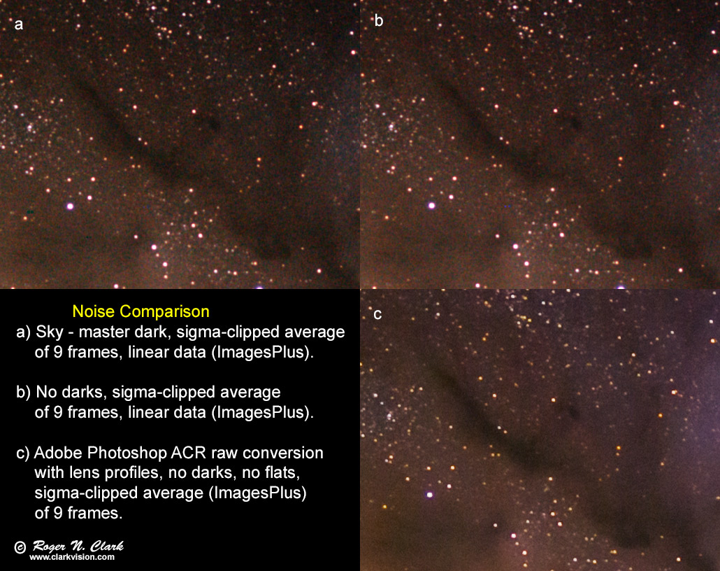 Then it is even funnier that critics on the internet insist on many things, like blue star gradients away from the galactic center. The stellar photometry data show such a claim to be bogus. There are other claims, including that one needs bias frames and scaling dark current. But bias is a single value (2048 on the 14-bit camera raw data from the Canon 6D), and the camera has on-sensor dark frame suppression. Thus there is no need for bias frames, nor dark frames, regardless of processing method. Including these just adds noise and that reduces what faint signals can be extracted. That's a hint: do not use the dark frames in your processing if you try the challenge, and use a good modern raw converter. Figure 8 shows the difference in methods and using dark frames. ImagesPlus uses a traditional raw conversion to linear data similar to other astrophoto image processing systems. The image in Figure 8b has lower noise than the image in 8a if bad pixels are not included in the statistics. Dark frame subtraction (8a) removes bad pixels in traditional raw converters. Modern raw converters, like ACR (Figure 8c) use the bad pixel list in the raw file to skip those pixels during raw conversion. ACR also allows noise reduction at the raw conversion level (the amount of noise reduction is completely selectable by the user, so if you believe the noise reduction in Figure 8c is too much, simply choose a lower amount). Trying to do noise reduction on the images in Figure 8a or 8b has a higher chance of making a splotchy background due to the color noise (which I have seen in attempts by some people in this challenge).