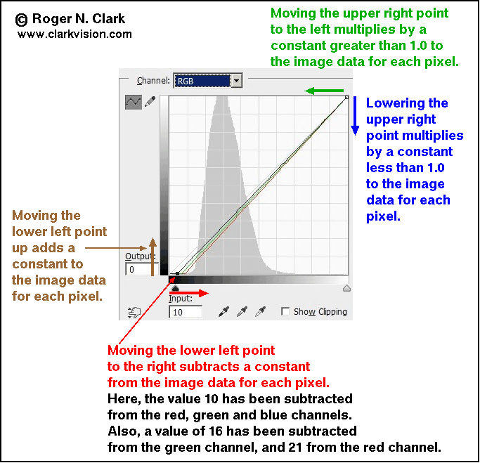 The basics of the effects of the curves tool are shown in Figure 1d. Light pollution should be subtracted, and you can do this by moving the lower left point in the curves too to the right, and moving it by different amounts in each color channel, thus subtracting different amounts of light pollution. Generally, the red channel has the most light pollution, followed by green then blue.