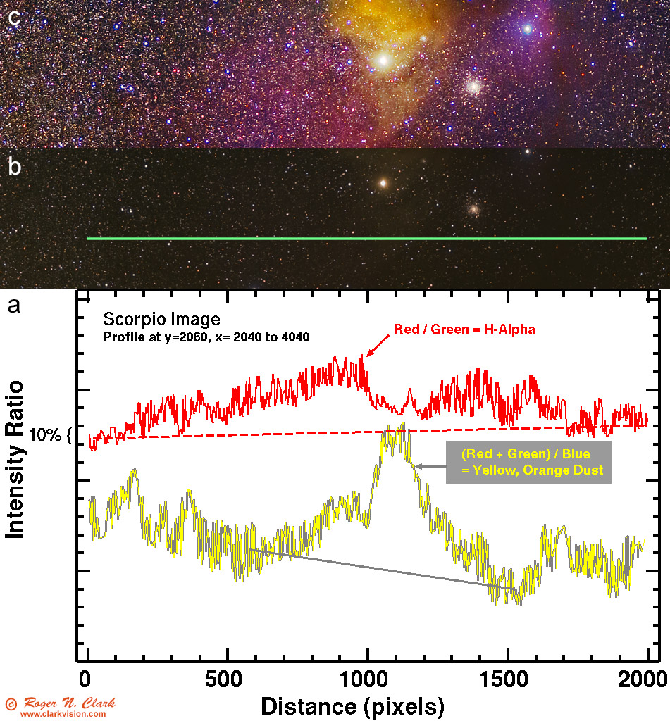 People on the internet are pretty funny. One the one hand someone says to image other H-alpha targets that are more challenging and on the other hand they say the H-alpha in the challenge image is too faint. I have even been accused of boosting the red channel to invent the red H-alpha nebulae in the image. The traverse shown in Figure 7 shows that the H-alpha nebula is clearly present in the data before any enhancements were made to bring out the nebula. It is such a clear signal, it is surprising that some have trouble making it visible.