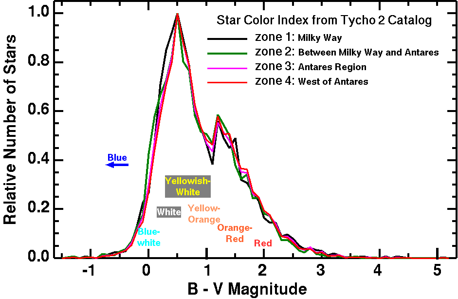 Well the internet is at it again. Many have tried my challenge below, but all too commonly they end up with a bluing of the stars from left to right. Some insist that the changing colors of stars to blue is real as one moves away from the galactic plane. To test the true color I used the Tycho 2 Star catalog of over 2.4 million stars down to past stellar magnitude 15 as described in Part 2b) The Color of Stars in this series. I split the region of the image in Figure 5 into 4 zones with zone 1 being on the left side of the image, working to the right and zone 4 is the right 1/4 of the image. I queried the Tycho data and plotted the histograms of the star colors in each zone in Figure 6. Not only do the star catalog data show that there is no bluing, notice zone 1 is highest in the blue and tends to be lower in the red. I also made maps of star colors as a function of position using the Tycho 2 star catalog data and the results are shown in Figure 7 of Part 2b) The Color of Stars. The star catalog data clearly show that, not only is there no bluing, there is a change to the red away from the galactic plane!