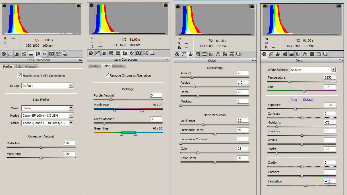 For this image I used the following settings in Photoshop's Adobe Camera Raw (ACR) (settings in Figure 2): I used no dark frames subtraction because the Canon 6D has on sensor dark current suppression, so none are needed. No flat fields were used because the raw converter removes the light fall-off using the lens profile. The 5 panels, from left to right in Figure 2 show the settings I used: