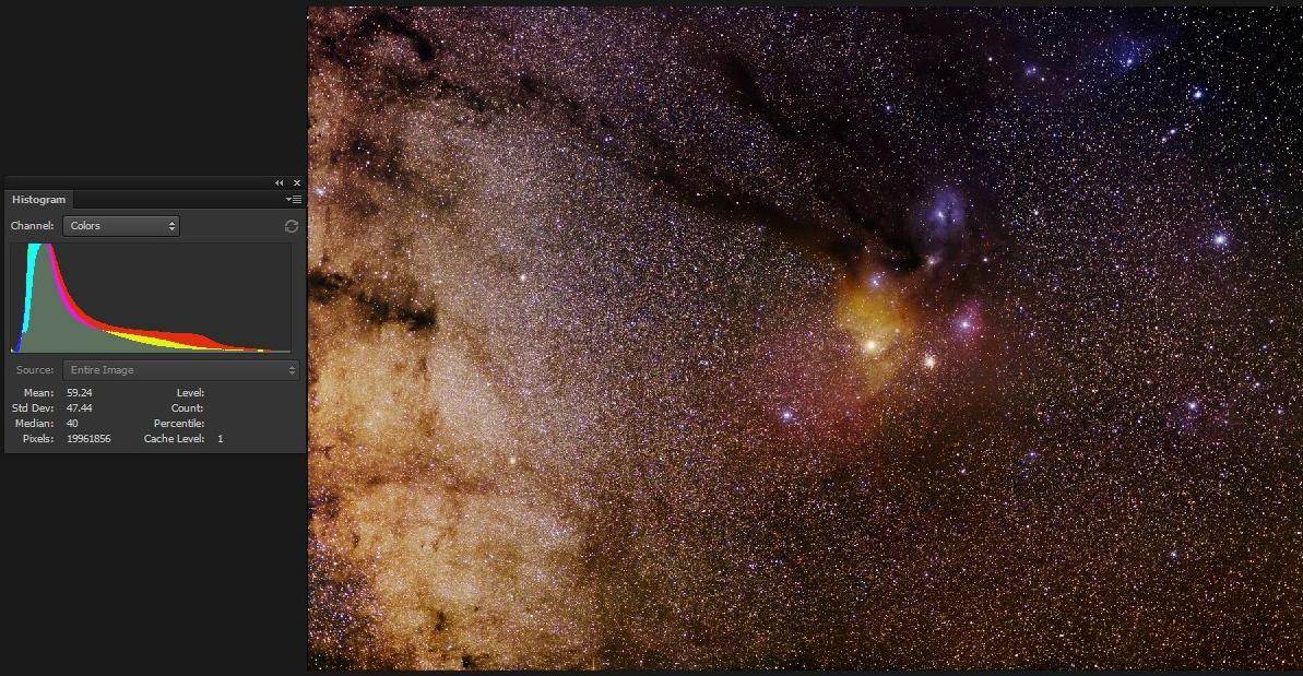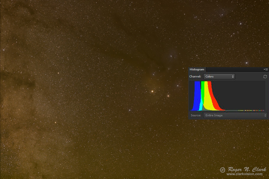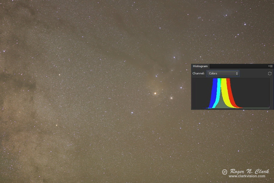 In subtracting light pollution, be careful not to subtract too much, or change color channel relative levels such that colors in deep sky objects are neutralized. For example, the full image histogram in Figure 4a - 4d still shows the red peak at maximum, green in the middle and blue lowest. The Milky way is reddish brown, so the histogram should NOT be neutralized, so making the histogram peaks line up should be avoided because the overall image should be reddish-brown. Aligning the histogram peaks or right edges has unintended consequences of reducing/warping other colors. For example, in other processing methods I have seen, neutralizing the histogram peaks in a case like this reduced the red channel, suppressing red nebulae (e.g. reducing hydrogen-alpha response--this is discussed below and shown in Figure 9).