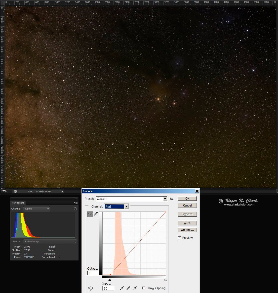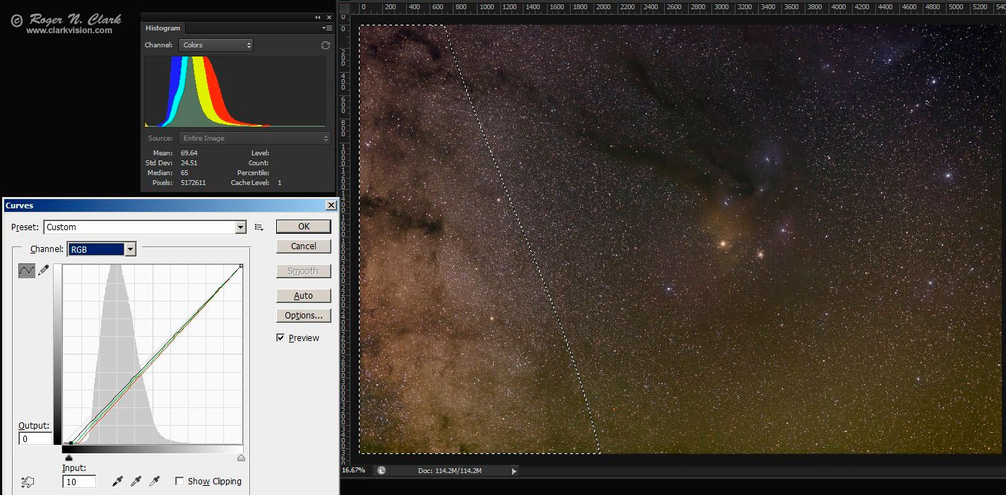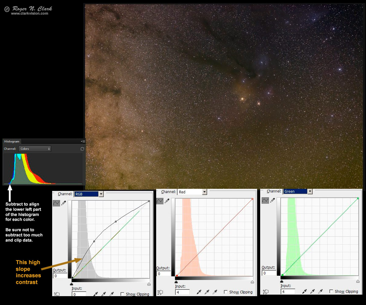 In the image editor use the curves tool to further remove light pollution by moving the lower left point in the curves tool to the right for each color channel. (The left slider in the levels tool does the same thing.) Figure 4a shows an example using the image in Figure 3 (the output of the stacking) where only the green and red channels have light pollution subtracted from the entire image. Light pollution is minimum in the upper left corner and the curves work made the sky a neutral gray in the upper left corner. Note in the photoshop histogram tool, if a triangle in the histogram window shows in the upper right corner, the histogram is not current, and you must click on the little triangle to update the histogram after each adjustment in any editing step. Failure to update the histogram may result in clipping because one does not have accurate information.
