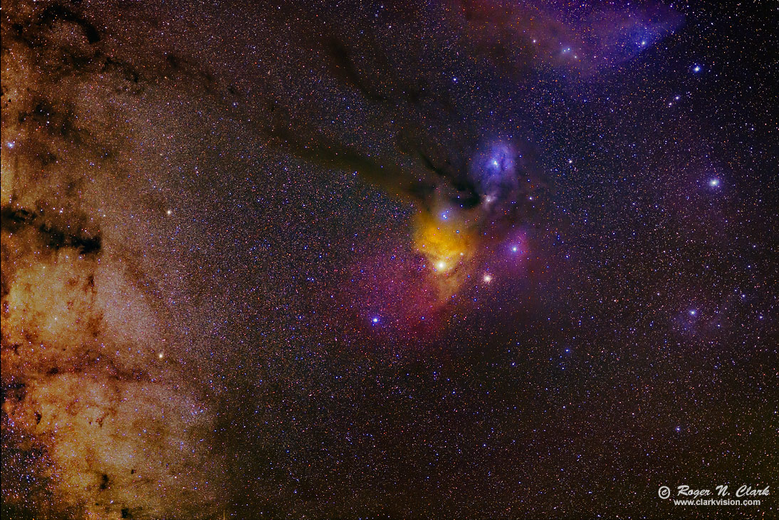 The sky images were obtained from a "green zone" (on the light pollution scale) west of Denver at an elevation of about 11,000 feet with no Moon. There is a light pollution gradient from left to right, as well as airglow. The Milky Way is on the left edge, so there is also a deep sky brightness gradient from the galaxy. Thus all together, with the relatively short total exposure time, it will be a challenge to bring out the nebula, including dark nebulae, hydrogen alpha nebulae, blue and the yellow reflection nebulae.
