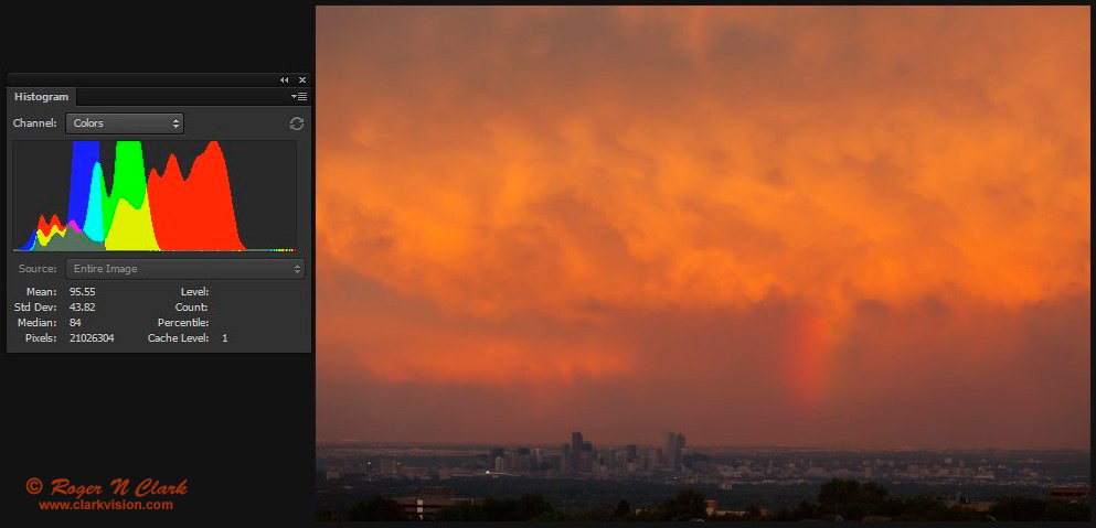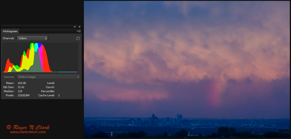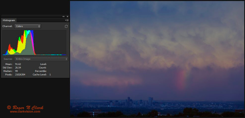 To show the effect white balance methods have on images, I show the effects of different processing in Figures 10a, 10b, and 10c. Clearly the auto color and histogram equalization (Figures 10b, and 10c) have destroyed the beautiful colors of the sunset. This will happen with ANY image that has a dominant color--the dominant color is suppressed in order to enhance other colors. Note that in Figures 10b, and 10c, we see more blue. The auto white and histogram equalization suppresses the dominant color and boosts weak colors. The histogram equalization in Figures 10c has also enhanced green, making green clouds! Clearly these colors are not real, nor did I see any such colors at the scene. Histogram equalization and auto white balance should be avoided in nightscape and astrophotography, and in my opinion, all photography where you want natural colors.