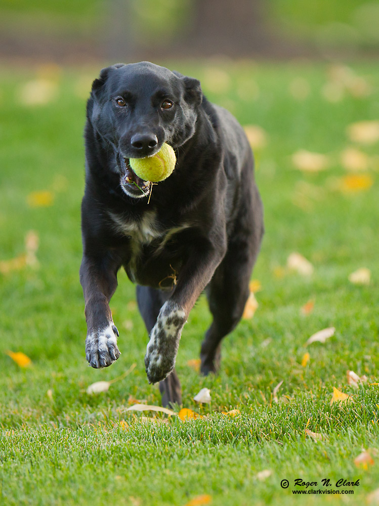Wildlife and domestic pets can also be a challenge for autofocus to track. Figure 3 shows a black dog with a brighter background running straight at the camera at about 8 meters per second (distance = 12 meters) with a complex background. Note the eyes are in focus: I used one AF point off-center and on the eyes to track the subject.