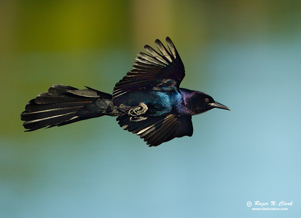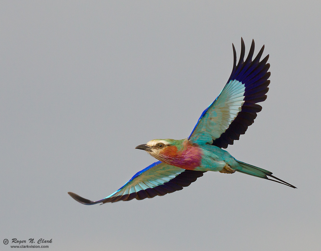 The toughest subject for autofocus to lock on and track is a dark subject on a varied and brighter background. Figure 1 shows a very fast flying boat-tailed grackle that was a particularly difficult subject to track. Small birds generally fly very fast and one needs to be at relatively close range if they are to fill much of the frame. Small birds are not only difficult for the autofocus system to track, but they are difficult for photographers to track with the small field of view with a long telephoto lens. The image in Figure 1 was made with a 500 mm f/4 lens mounted on a Wimberly gimbal head. Figure 2 shows a very fast flying lilac breasted roller made hand held with a 300 mm f/2.8 lens.