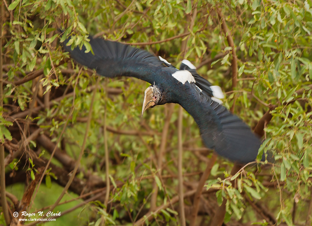 Figure 4 illustrates the need for fast acquisition and tracking. The crowned hornbill was flying through the trees. Light levels were low and I was photographing another subject. I saw the bird, quickly turned to catch it, the AF locked, began tracking and I got this dark bird flying in the trees. Without the extremely fast AF of the 300 f/2.8, and a fast camera, this image could not be obtained. Note the sharp focus on the eye. Yes, the background is cluttered with all the branches; the point is AF performance.