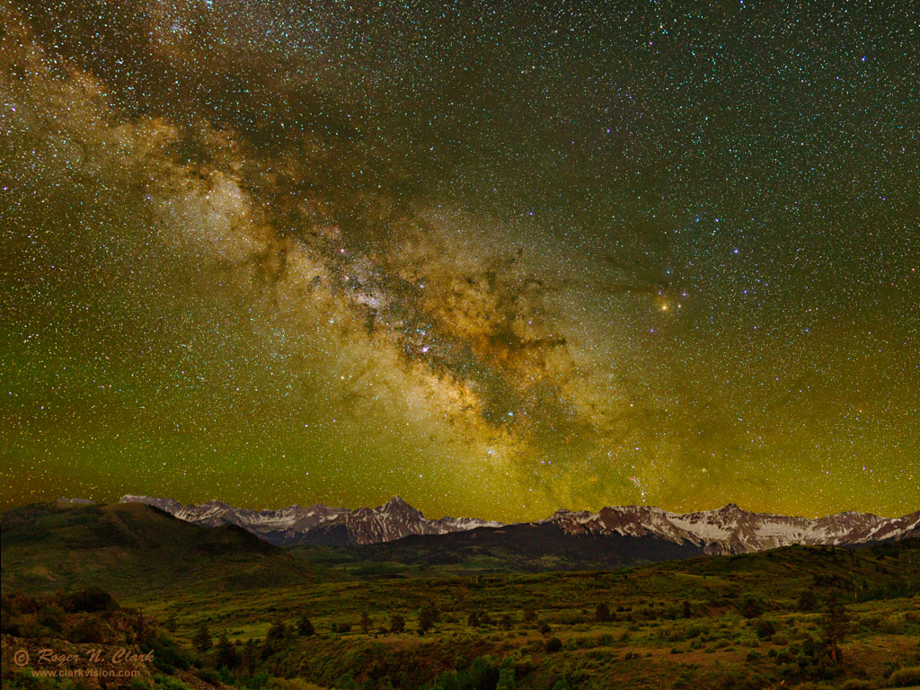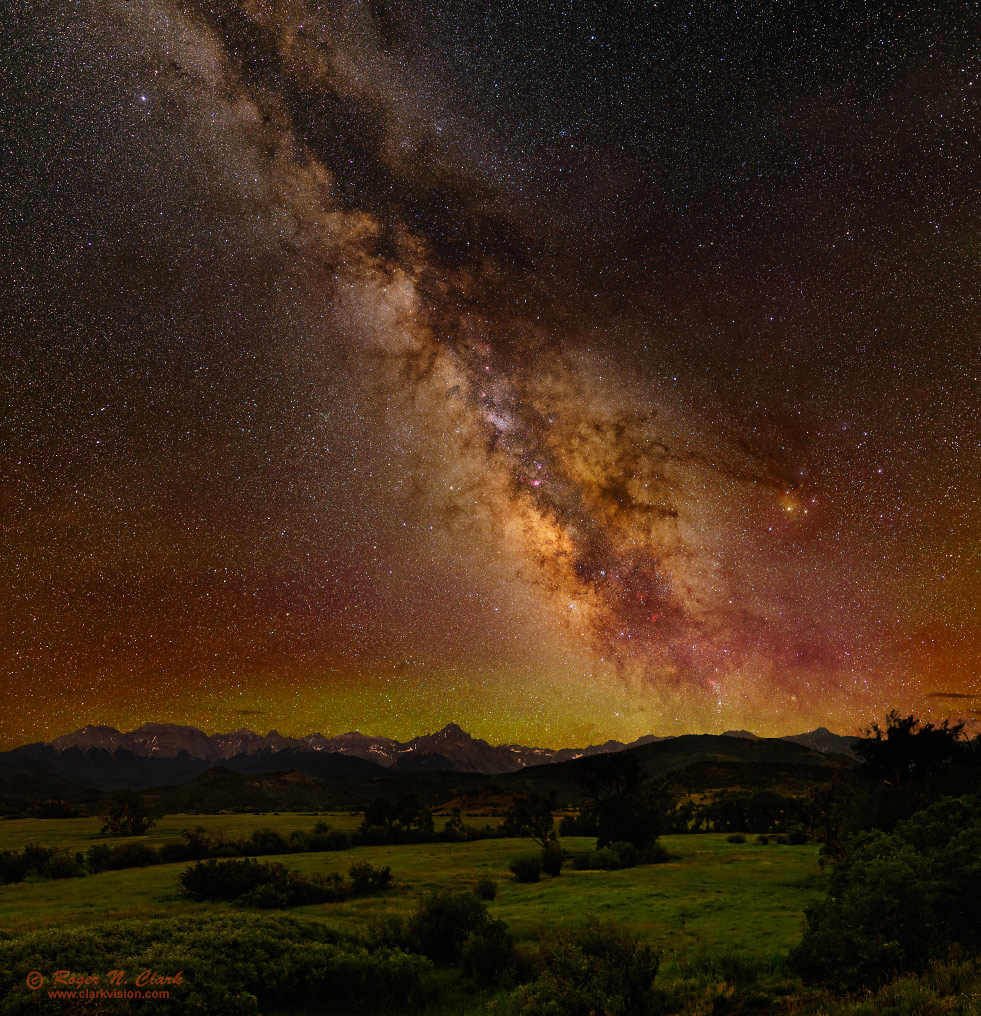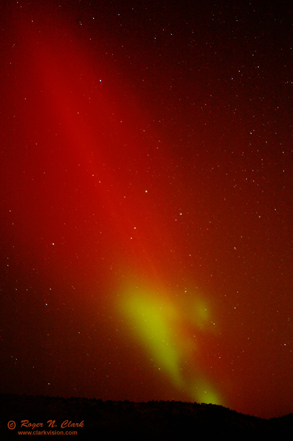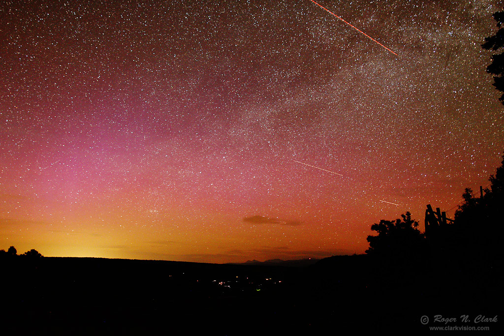The airglow also shows color when it gets bright enough. On the night of the image in Figure 12, the green band on the horizon did have a distinctly greenish-gray color compared to the sky above (the red was too faint to distinguish red color and appeared gray to em). As the airglow brightens, the color comes out, and I have seen pinks, greens and reds many times over the last year or so from Colorado. The scene in Figure 9, which was made of the same mountain range as that in Figure 12, only a few miles away, was made on a night of strong green airglow to the south, but strong pink aurora to the north. Before I made a quick exposure of the northern sky, I could tell it was a pinkish-red aurora, and the camera confirmed it Figure 13).