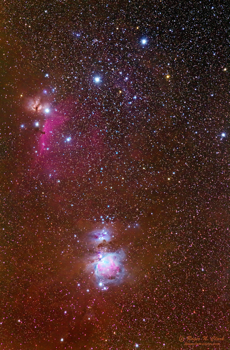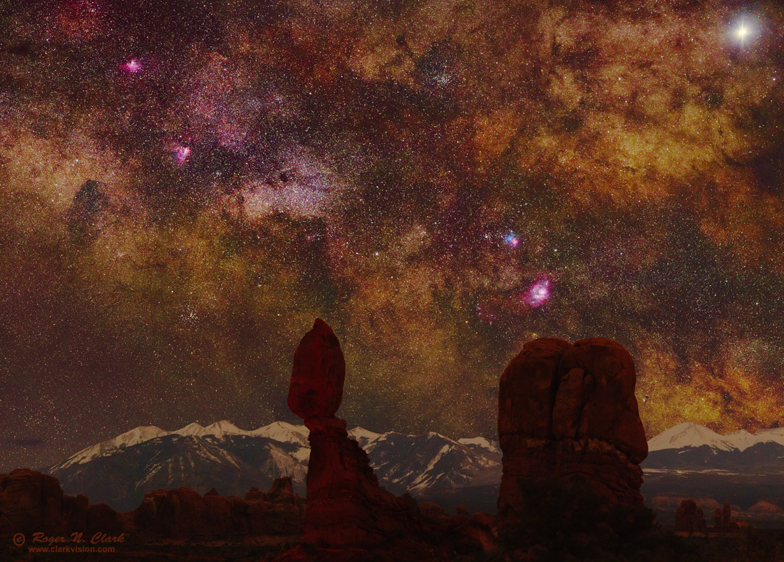 Many night sky digital photographers have the idea that the night sky is blue and torque the color balance to make everything in the night sky a beautiful deep blue. One way they do this is to use a fluorescent light color balance. Figure 10a gives one such example processed with a fluorescent color balance. Figure 10b shows the more natural color balance. The star clouds of the Milky Way are reddish-brown. Stars have more subtle colors, ranging from red to orange to white, and bluish-white. The color of the sky is green from oxygen emission (the green bands are called banded airglow), and red from oxygen and hydroxyl.