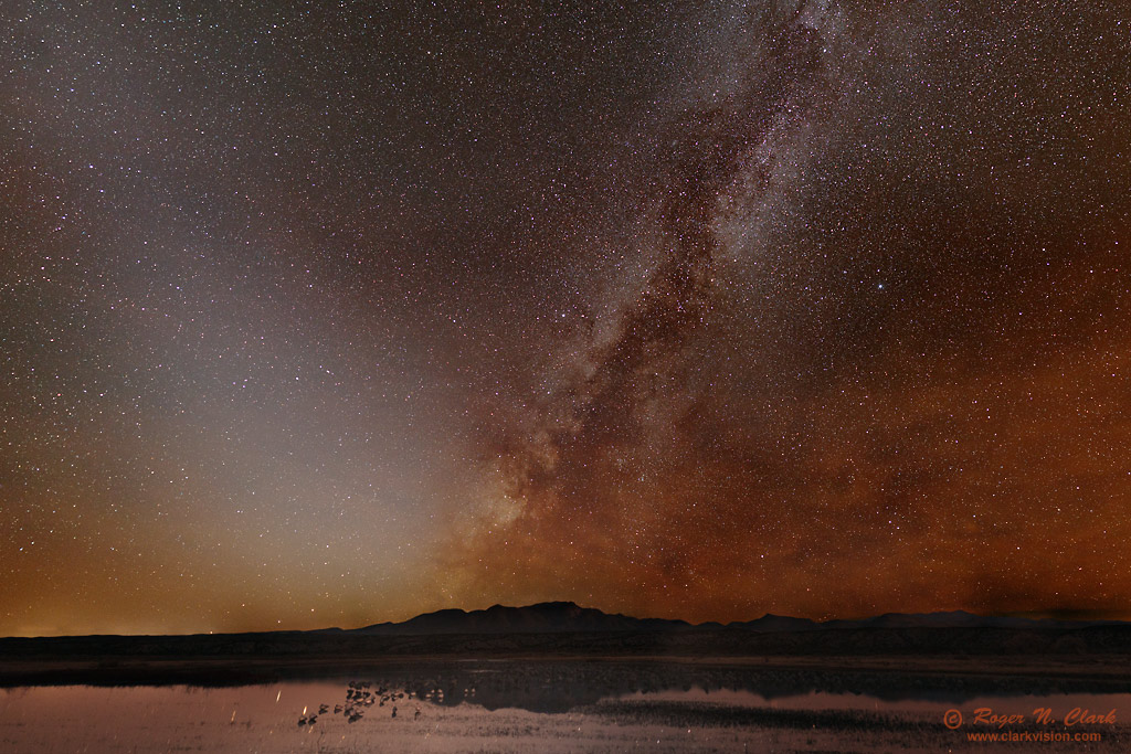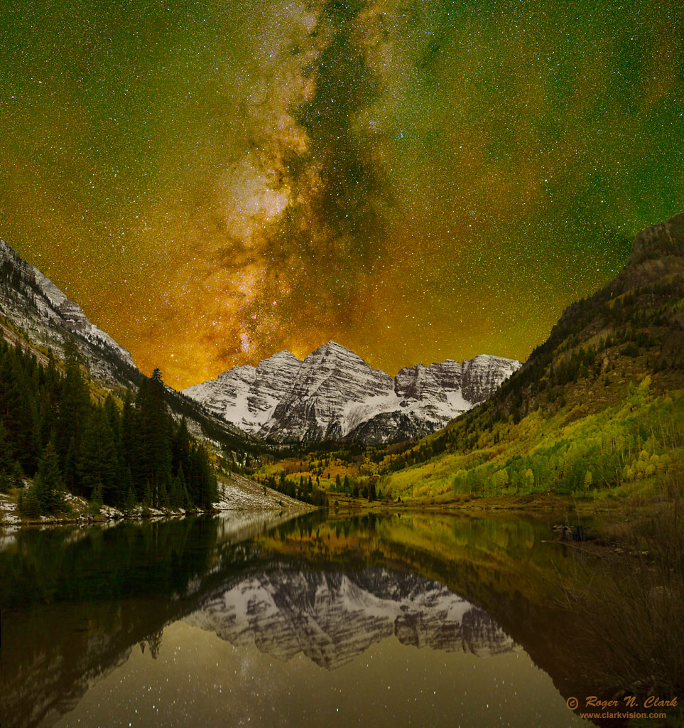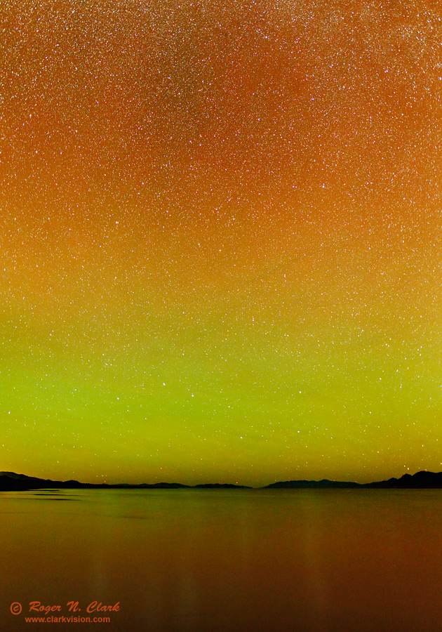 Image Color Balance. The image above (Figure 1b) has gotten a lot of comments, some quite off the mark. For example, "consider changing the tint to more accurately depict what was seen that night (more black/blue than green)." The Earth's moonless night sky is rarely black or blue, especially at solar maximum when this image was obtained in September, 2013. With the red and green airglow emission, as noted in the Figure caption, the dominant light on the landscape from the night sky was yellowish green when this image was obtained. The lake reflection loses some of the yellow and enhances blue due to the index of refraction of water being higher in the blue than in the red, so the color of the reflection will always be different. Also, note the reflection toward the bottom of the image is more brown. That is particularly evident on the left side in the reflection of the pine trees. The brown color is due to light reflected off the bottom of the lake, from the brown mud, and that reflection reduces contrast in the reflected light of the land and sky. In the sky, the Milky way is low in the sky so is reddened much like the sun appears more red when low in the sky. I process my images on a color calibrated monitor using color calibrated workflow. The colors shown represent the correct color tint. Of course I adjust contrast and saturation to make a beautiful image, but if this image could be made on fine grained color slide film, the colors would be similar but more intense and with higher contrast. The image was made with a "sunny" daylight color balance on the camera. More on color balance below.