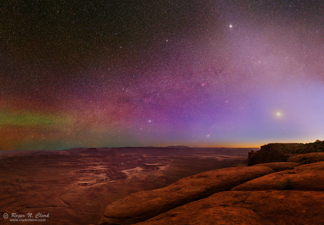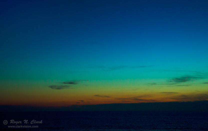 Compare the color in Figure 3 with that in Figure 11a. On this night, there is no detectable green airglow from oxygen at the 558 nm emission line. The night sky is dominated by red in Figure 3, an indication of emission dominated by hydroxyl. Airglow also occurs during the day, and in fact is much stronger than it is at night. We do not see it because the scattered sunlight is so much brighter. But on nights when the green airglow from oxygen is active, we can usually see it in deep twilight as a green band near the horizon (Figure 11b). On the night in Figure 11b the green airglow was strong. You can predict how the beginning of a night my be concerning the intensity of the green airglow by watching for this green color band in twilight. Conditions can change in less than an hour, so observing the green band is only an indicator.