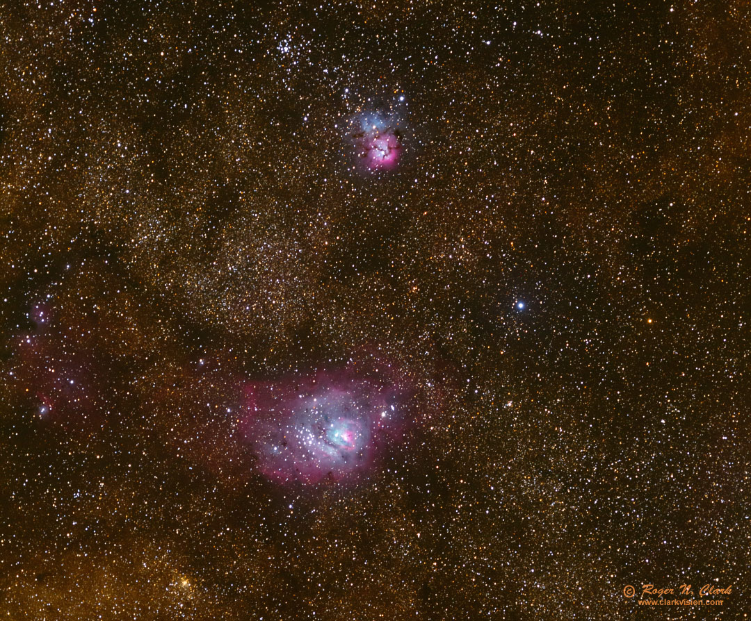 We can actually see some colors at night. For example, bright stars show colors visible with our unaided eye(s). Antares (the bright star near the right edge in the image), shown in Figure 12 is distinctly orange to the (normal) eye. Altair (upper left corner) is white/bluish-white. If really well dark adapted (no bright red lights) the star clouds of the Milky Way around Sagittarius show as a faint yellow-brownish color. If you use a good telescope, some of the red emission nebulae do appear as a pastel pink (M8, M20 in the image), and blue reflection nebulae do appear light blue (M20 northern component, the Merope nebula in the Pleiades, M45). M8 and M20 are seen in Figure 12 near the center, and a close-up is shown in Figure 5.