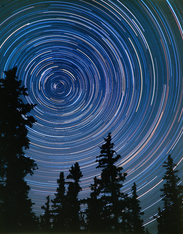 If been asked to look at the film area when film recorded skies as blue. I've been imaging the night sky since junior high school, long before the digital camera era. I have thousands of color night sky images. The color of the sky in my images is all over the place: magenta, green, yellow, red, blue, and black. The problem with long exposures on film is reciprocity failure, and the different colors in color film have different failure rates. Thus the colors drift depending on the film and how it is handled. Colors were simply not reliable at the long exposure times required. Figure 8 shows a nice star trail image with a blue sky. But I started the exposure in deep twilight, so it naturally recorded some blue. Is the green real or from reciprocity failure? No, film did not reliably record accurate colors in long exposure night photography, unless one accurately calibrated the reciprocity failure of the different colors and used the appropriate color correction filters.