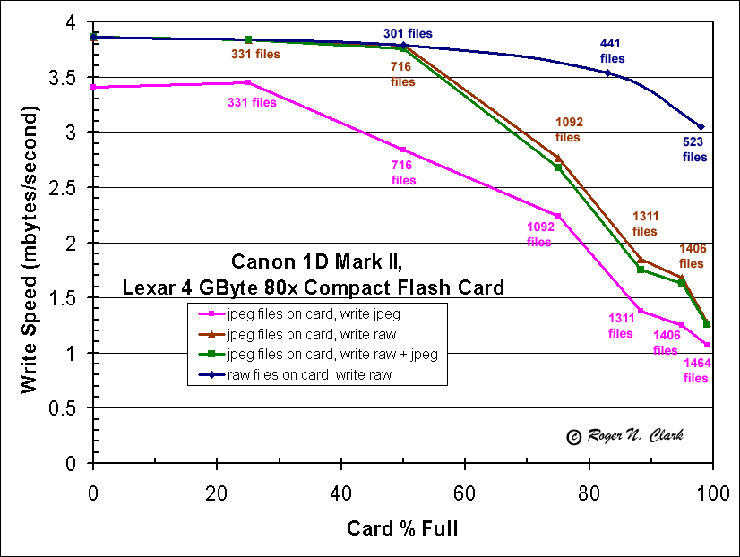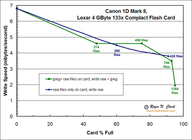 The following assumes these tests are a general property of compact flash cards. Clearly more testing is needed to confirm how general these conclusions are. Also, due to the windows file system architecture used by digital cameras, a different directory structure may give different results. The 1D Mark II camera puts all files in one directory. Other Canon DSLRs I have used (D60, 10D. 20D) all put a maximum of 100 files per directory and then create multiple directories. That design may have better performance, but it remains to be tested.