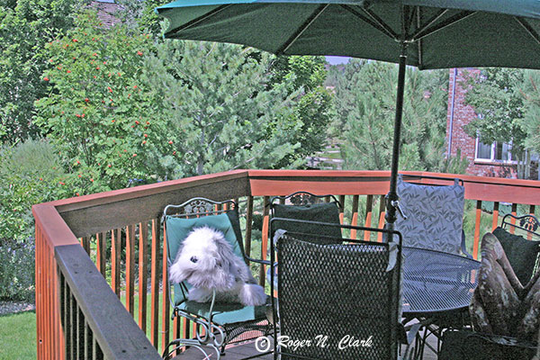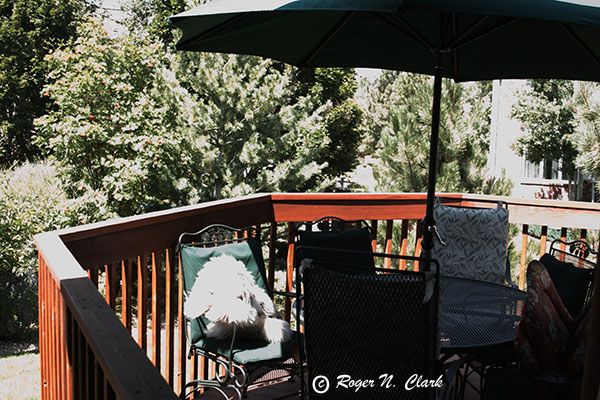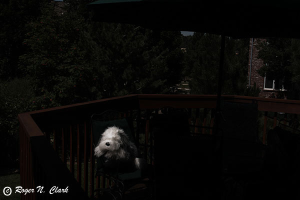 A test image was made showing a deck, some trees, some objects in shadow, and a white stuffed animal in full sun. What is the dynamic range from the darkest darks to the brightest highlights? The images were recorded with a Canon 10D camera in raw + jpeg mode at 77 degrees F, ISO 100, Canon 28-135 mm zoom at 28mm. The image shows a large dynamic range that does not display well in any one exposure. Exposures were obtained from 1/30 second to 1/4000 second to be sure the darkest areas were recorded above the noise floor, and the brightest portions did not saturate.