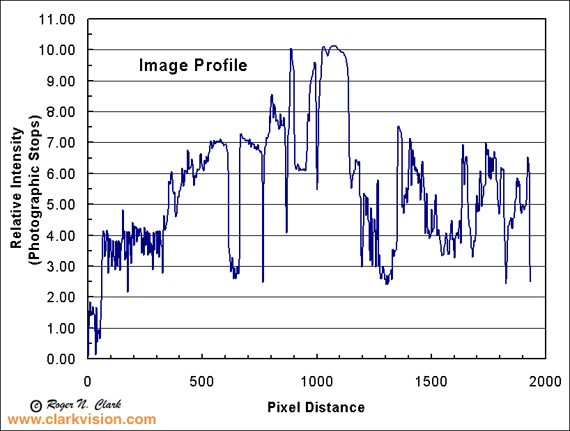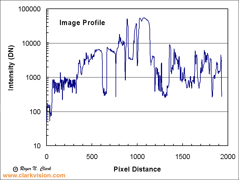 The plots below show a traverse across the image to illustrate the intensity variations. Two plots are shown, Figure 6a shows scene intensity (on a 0 to 65535 DN scale) and the other in relative photographic stops. This traverse shows over 10 stops of intensity. The traverse is like having a spot meter measuring 2000 spots, each less than 2-arc-minutes in diameter. The full image is like having a spot meter with over 6-million measurements of the intensities in the image.