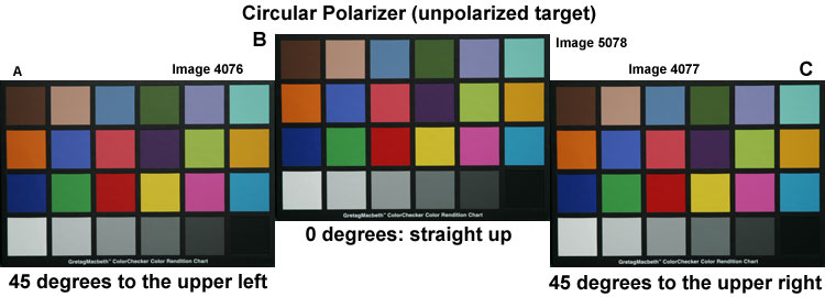 Figure 3. GretagMacbeth Color test chart illuminated by the sun on a cloudy-bright day. Circular polarizer was recorded in 4 positions, 3 shown. The 4th was in a horizontal position. The metered exposures were the same in all positions, as is the color balance. There was a small change in color in the viewfinder that was induced by the viewfinder optics that was not a property of the target nor was it recorded in the image (the image is correct for all positions of the polarizer, compared to the 1/3 stop error introduced by the linear polarizer).