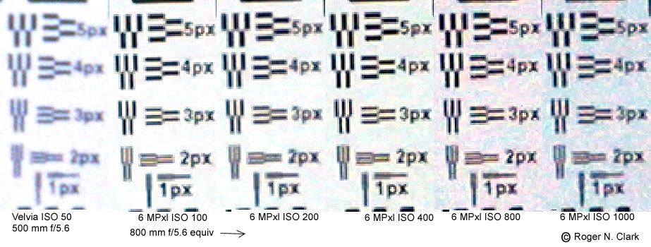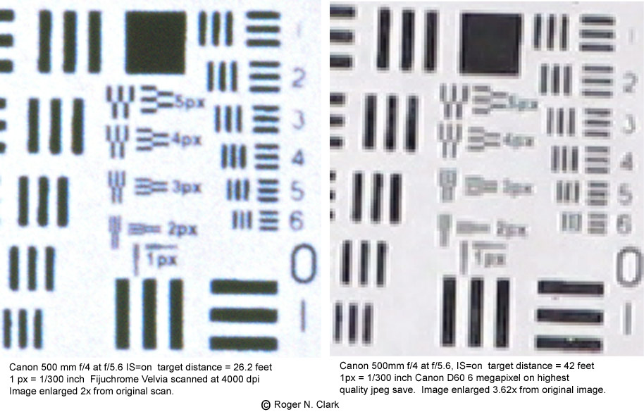 In the seemingingly constant question of film versus digital, how many megapixels will it take to match film? Here more tests. The same lens and tripod was used: a Canon 500 mm f/4 Image Stabalized lens. A resolution test target was set up and imaged with a Canon Elan 7e (film), and a 6-megapixel digital camera (D60).