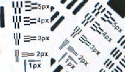 However, the test target is an idealized case for the digital camera, as the sensors line up with the lines of the target. The real world is not as organized. So below is a comparison of a rotated target.