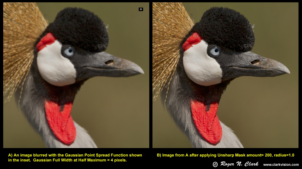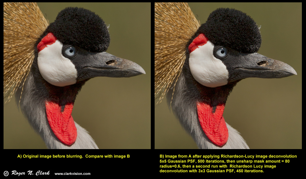 The three methods tested used Photoshop CS5 for the Unsharp Mask and Smart Sharpen tools and ImagesPlus for the Richardson-Lucy image deconvolution. Figures 1, 2 and 3 show the blurred image on the left and the sharpened image on the right. The test image is that of a crowned crane obtained in Tanzania using a Canon 1D Mark IV digital camera and 300 mm f/2.8 lens. The original image was downsized using 3x3 pixel binning which improves signal-to-noise ratio by 3x and produces a very sharp image. The original image is shown on the left in Figure 4.