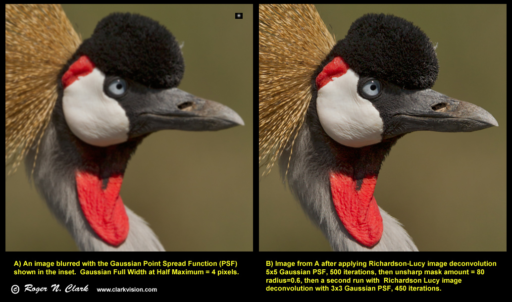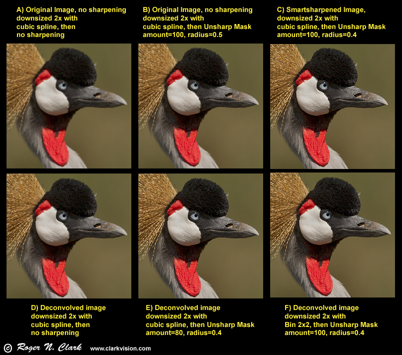 Anyone is welcome to take the original blurred image in my first post in the series and down sample by 2x and then sharpen to try and produce a sharper result than I show in Figure 7 (e.g. images E or F). The 16-bit tiff (778 Kbyte) blurred image is here: crowned.cranec02.25.2011.C45I7154.ps.b-bin3x3-gaussblur1.0c1.tif and you may download it and manipulate it for non commercial uses. Let me know your results if you produce a sharper down sampled image.