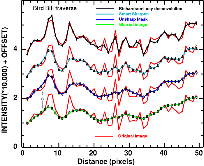 The traverses from the images compared to the original image (Figure 6) show that while unsharp mask and smart sharpen enhances local contrast (edge contrast) but do not improve resolution. This is particularly apparent around pixel 4 to 8 in the traverse. Note the gray arrows labeled with the letter A. The unsharp mask (blue) and smart sharpen (cyan) traverse lines are larger at the base of the large peak at pixel 7 to 8 than the original blurred image (green line). So while unsharp mask and smart sharpen has increased accutance, the sizes of some detail has grown larger than the starting image, thus reducing resolution. The Richardson-Lucy deconvolution traverse (black line) has not only improved accutance, the sizes of detail has become much smaller than in the blurred image, increasing resolution over the blurred image by about 2 times.