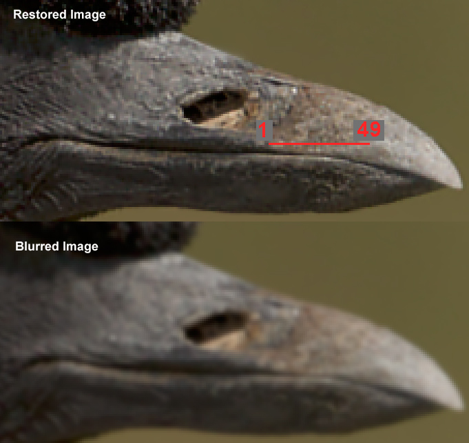 The perception of sharpness in an image contains several factors. One is how much from pixel to pixel the intensity changes. For example in the blurred image on the left in Figure 1, the transition from the white feathers on the bird's cheek to the black feathers occurs over several pixels. That means we perceive the image as soft. But a hard edge (e.g. white to black in one pixel) is only part of sharpness. Now look at the catchlight in the bird's eye. The catchlight also appears soft. Same with bright spots on the bird's bill, and structure in the birds feathers. These image components are spread out. It is not just the transition over several pixels, but the size of the strictures. A sharp image includes small components, the fine detail, down to the limit of vision. Thus, it is the size of the finest details that also contributes to our perception of sharpness. An image that contains both high accutance, and small details is considered sharp. A high accutance image that does not contain fine details might be considered sharp by some viewers but the image will pale in comparison to the same scene that also contains the fine details. In that comparison, the high accutance image would no longer be considered sharp compared to the image with both high accutance and fine details. Ideally, we could take an unsharp/blurry image and improve the fine details, actually improving image resolution and accutance. It can be done.