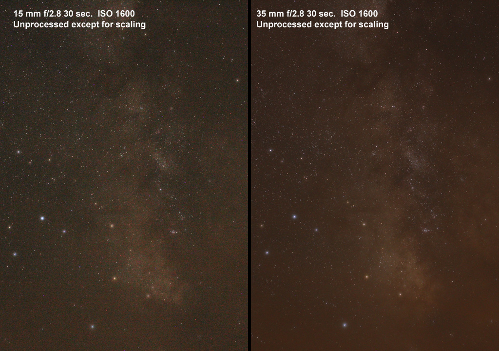 Let's compare the results from two f/2.8 lenses in low light imaging of the night sky where noise is a common problem because one can rarely get enough light. Figures 5a and 5b show images made at 15 mm f/2.8 and 35 mm f/2.8, using the same exposure time, ISO and sensor. The 15 mm lens has a 5.36 mm aperture at f/2.8, while the 35 mm lens has an aperture of 12.5 mm. Thus the 35 mm lens collects (12.5/5.36)2 = 5.4 times the light from the SUBJECT in the same exposure. Here, the subject can be a star, a star cloud, or even the sky background. Note how many more faint stars show in the 35 mm image. This is due to the larger aperture.