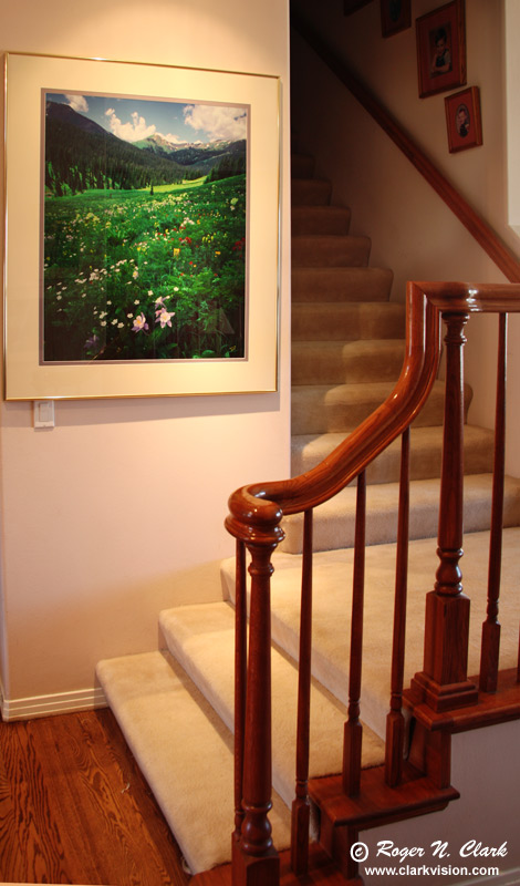 Size matters: larger prints get more attention, assuming an interesting image (again content). For example, consider a series of prints: 4x6 inches, 8x10, and 16x20. You could place the larger prints at further distances so they appear the same angular size to your eye. But the 16x20-inch print has more impact. Why? We perceive the larger print as large because our binocular vision and context with the surroundings tell us it is larger. Being larger, we perceive it to have more impact. It is like watching a movie on a large screen: we could watch the same movie on a small computer screen with the same angular resolution, but it simply does not have the perceived impact of the large screen.