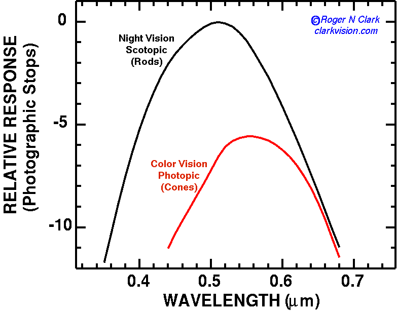 The common night observing light is a red light. But I have often observed that the red lights people use are so bright they will significantly harm night vision. A bright light of any color, when it is so bright that one actually sees strong color is probably too bright. The rods (night or scotopic vision) are more sensitive to light than are the cones (photopic vision) at ALL wavelengths (Figure 1). The data in Figure 1 shows that simply because a light is red, it can still harm night vision if too bright.