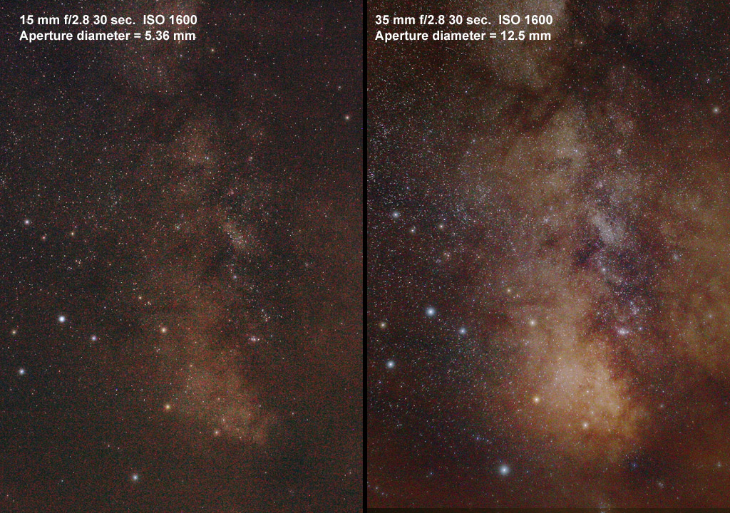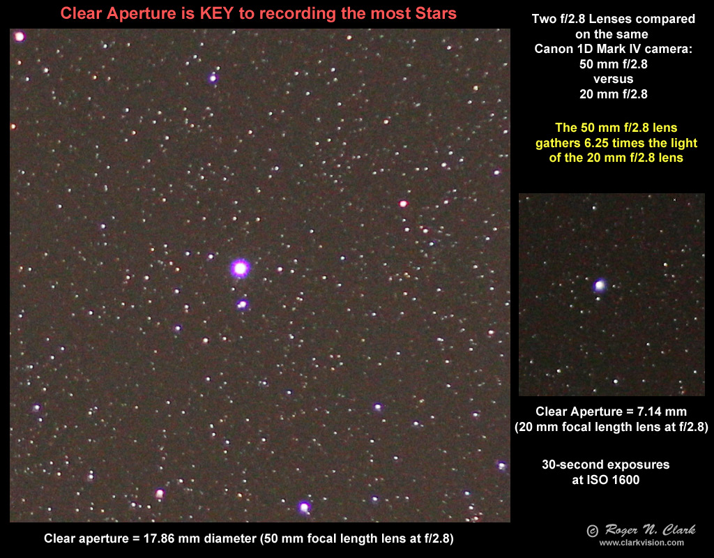 Now that we've debunked the ISO and pixel size equals higher sensitivity myths, the real story in nightscape system performance is the lens: larger clear aperture lenses collect more light. Astronomers have known this for centuries; that is why they build large telescopes: to gather more light. The key to more light gathering is the clear aperture of the lens, and not the f/ratio as is commonly believed.