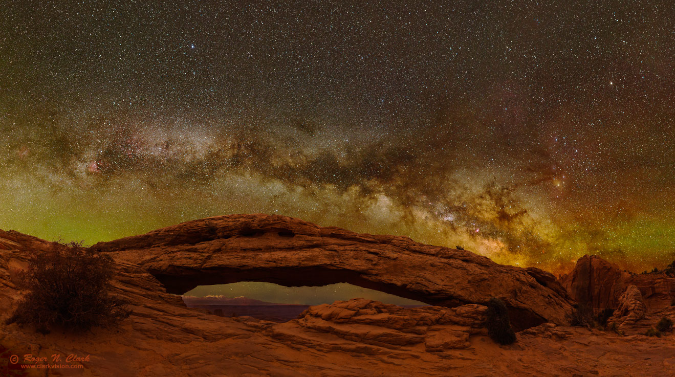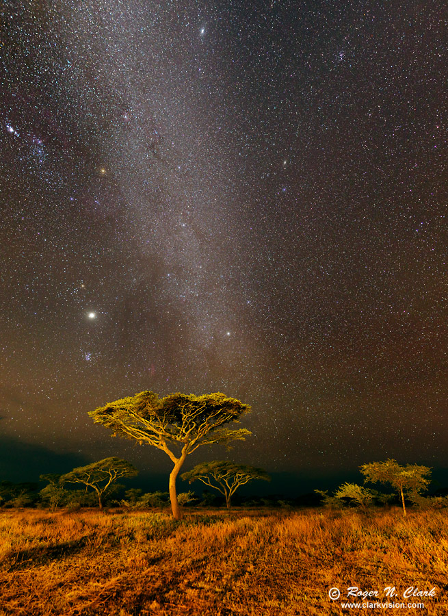 The exposure times above for a static camera are really too short to collect enough light to record many stars. To keep star images round with long exposure times, one must track the stars to compensate for the rotation of the Earth. In a nightscape, that tracking stars means any terrestrial landscape objects would get blurred. My solution on such frames is to make two exposures: one with tracking on for stars, and one with no tracking for the static scene. Then I stack to two images in a photo editor and select the sky from the tracked image and the landscape from the untracked image and merge the two. In making such exposures, the tracked and untracked pair should be done one right after the other. An example is shown in Figure 7.
