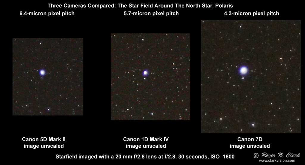 If we compare the Canon 5D Mark II, 1D Mark IV, and 7D, which will come out on top for nightscape photography. If we believe other web sites and magazine articles, the 5D Mark II, with its large pixels should record much fainter stars than the smaller pixel size cameras. Figure 4a and 4b shows the real story. Which camera image shows the faintest stars? It is clear that the 7D shows the most, with the 1D Mark IV a close second, and the 5D Mark II trailing behind. This is exactly what was predicted by the data in Figure 3.