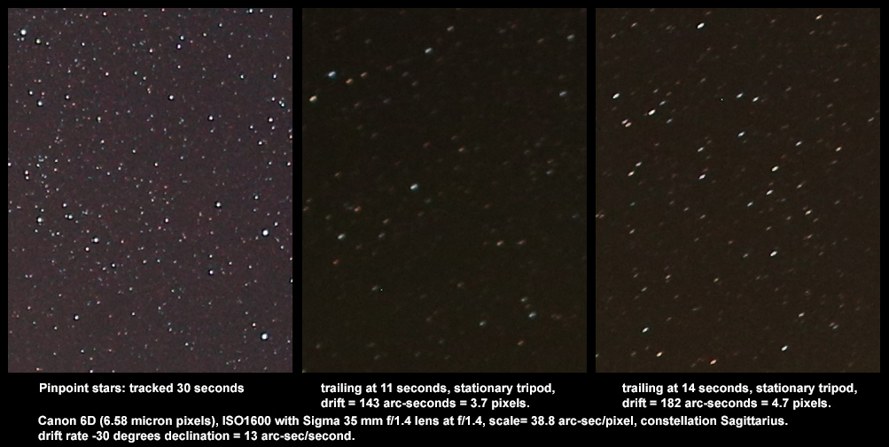 At 8 seconds, the drift would be 2.7 pixels and would produce oval stars (Figure 6a), but would be slightly worse on the celestial equator. Six seconds would produce pretty good stars (Figure 6b). At 6 seconds, the rule would equate to 210/focal length in mm, close to equation 1. For cameras with smaller pixels, shorter exposure times are needed in order to keep stars round.