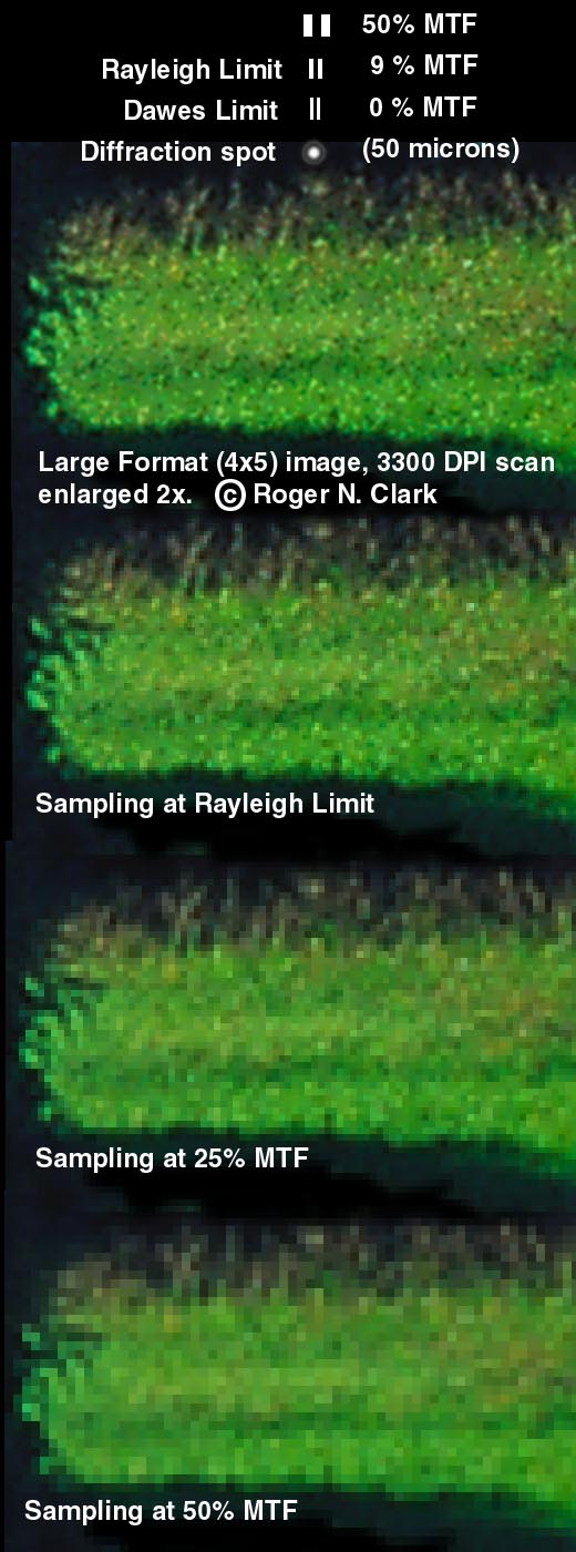 The 3300 dpi scan (top image) is 7.7-micron pixels, or about 3 pixels per cycle at the Dawes limit. The next image is 2 pixels per cycle at the at the Rayleigh limit. There is slight degradation of the image. Sampling less than this rapidly lowers image detail as seen in the bottom two images. The conclusion is 2 to 3 pixels per cycle at the Dawes limit records close to all the detail in the image, but 2 pixels per cycle at the Rayleigh limit is pretty close.
