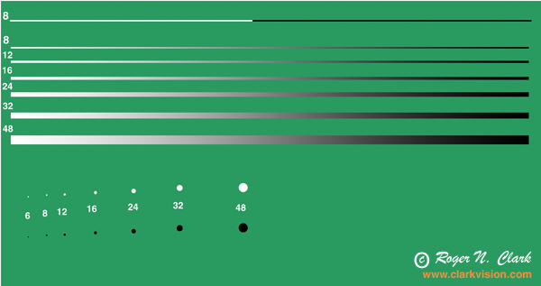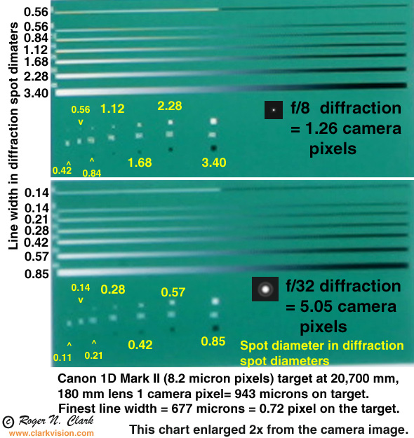 The above test using film may be confusing because the grass blades are incompletely resolved for two reasons: diffraction, and film grain. So a more rigorous test was devised using the test chart in Figure 3. The chart was printed at 300 ppi and placed 20,700 mm away from a camera with a 180 mm lens and the chart was imaged. The distance was such that some of the lines are well below the diffraction spot diameter, and if there were alternating lines with separations the thickness of the lines, no lines could be resolved (0% MTF; that is illustrated by the numbers by each line and spot: they appear as blobs in Figure 4 because the lines making up the numbers are too close together to be resolved). But the test results (Figure 4) clearly show that small lines and spots, smaller than the diffraction limit, can be detected if they are isolated (not near other spots or lines). Also note that the smaller lines and spots appear smaller than the diffraction spot diameter. This is due to a contrast effect: only the brightest central portion of the diffraction disk is obvious. Such small detail needs to be adequately sampled, for example, when scanning film. This test is of a relatively low contrast subject. real images can include higher contrast sub-diffraction subjects, including stars, backlit hair, twigs, branches, grass blades, and many other subjects. Scanning such detail can be important in recording and printing fine detail that makes prints have that "wow" factor.