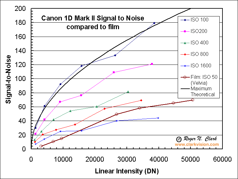 The comparison in Figure 1 shows that the Canon 1D Mark II has a signal-to-noise at ISO 800 that is still better than fine grained ISO 50 film. At ISO 100, the 1D Mark II has signal-to-noise on the order of 3 to 6 times higher than Fujichrome Velvia, ISO 50 slide film. Higher speed films have greater grain and lower signal-to-noise.