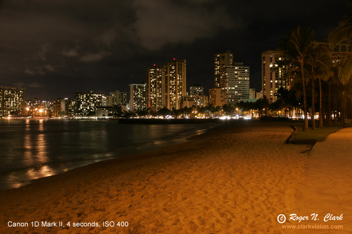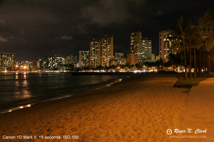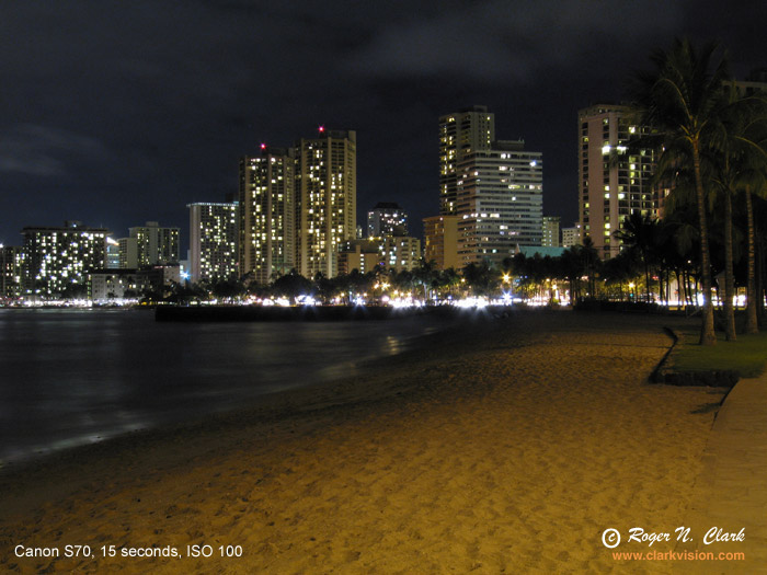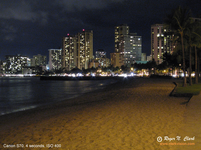 Ignore the color balance differences in the images in this article, and examine the noise. A small pixel can not collect as much light as a large pixel, much like different sized buckets in a rain storm: the large bucket collects more water. But how much? For the range of cameras tested so far, that range amounts to a factor of about 16. The effect of this ability is the small pixel camera with its smaller lens operating at a low ISO of 100 is like operating a large pixel camera at ISO 1600, because the larger camera generally has a larger lens. The example images of a night scene showing Waikiki Beach and the city of Honolulu illustrate these effects.