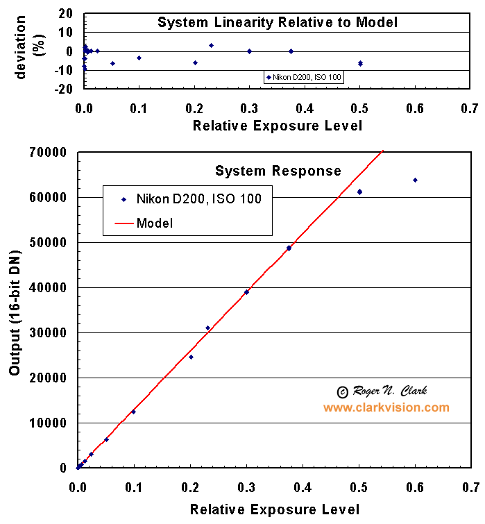 The system linearity of the Nikon D200 is shown in Figure 1, and is very good. System linearity includes the detector linearity, shutter reproducibility, f/stop reproducibility, and light source stability. At the very highest signals at ISO 100, the Nikon D200 departs from linearity above about 60,000 in a 16-bit tif file (within about 10% of saturation).