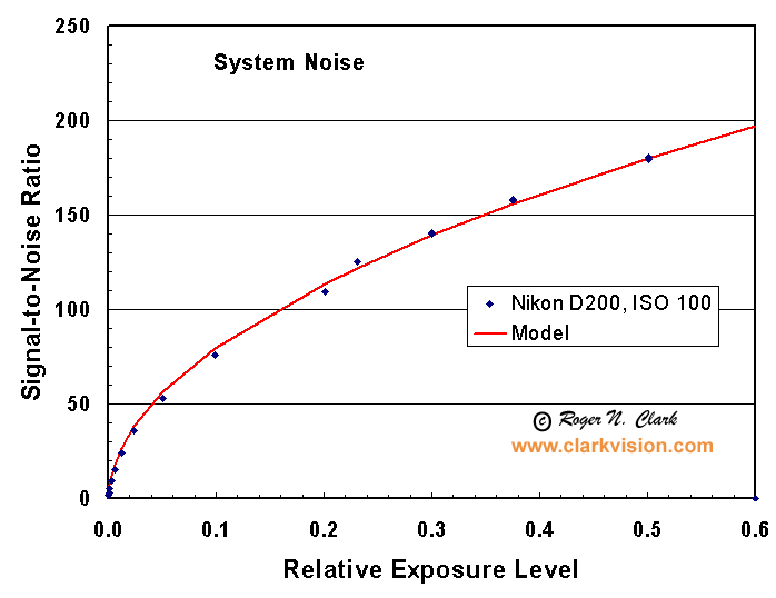 The signal-to-noise ratio as a function of intensity is shown in Figure 2. If the sensor is photon noise limited, the trend in this ratio is a square root dependence. If the system is photon noise limited, the signal-to-noise ratio squared directly equals the number of photons collected without needing gain conversions, or computing the slope of a line. The fact that the model matches the data very well indicates there are no other sources of noise contributing to the data at any significant level. Thus, for high signal levels, the Nikon D200 is photon noise limited. This means further improvements in electronics will not improve the signal-to-noise ratio for high signal levels. If the quantum efficiency were improved with a different sensor, that would certainly improve the signal-to-noise ratio.
