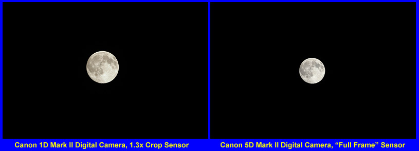 The crop factor effect is illustrated in Figure 2 with images of the Moon from 2 cameras. It appears that the camera with the 1.3x crop shows the Moon larger and thus with more detail. But Figure 3 shows the real story: in this case the full frame camera has the Moon larger with more pixels on the moon. The reason is that the number of pixels on the subject in an image has nothing to do with crop factor.