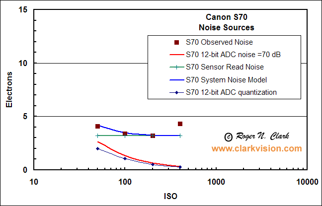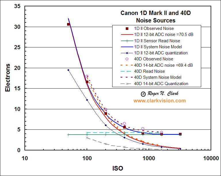 At high signal levels (most of the range of a digital camera image), noise per pixel is dominated by photon noise, the inherent random arrival times of photons at the sensor. At the lowest signal levels, other sources contribute. There is sometimes confusion over what are the sources of such low level noise. For example, Table 4 below shows apparent read noise is high (when expressed in electrons) at low ISO and decreases with increasing ISO. Figures 8a and 8b show the sources and reasons for these trends. At low ISO large pixel cameras, typical of DSLRs collect enough photons that photon noise is small compared to read noise and noise from the analog-to-digital converter (ADC). Some call this quantization noise, and while such noise contributes to the total ADC noise, other noise sources in the ADC stage dominate, especially on newer cameras with 14-bit ADCs (the Canon 40D in Figure 8a). On small pixel cameras, the analog gain is high enough that at low signals, read noise dominates the noise sources and ADC noise is a small factor (Figure 8b). The small pixel camera in Figure 8b looks like is has better low ISO performance than the large pixel cameras in Figure 8a, but that is not the case, because the large pixel cameras collect many times more photons/pixel in a given exposure.