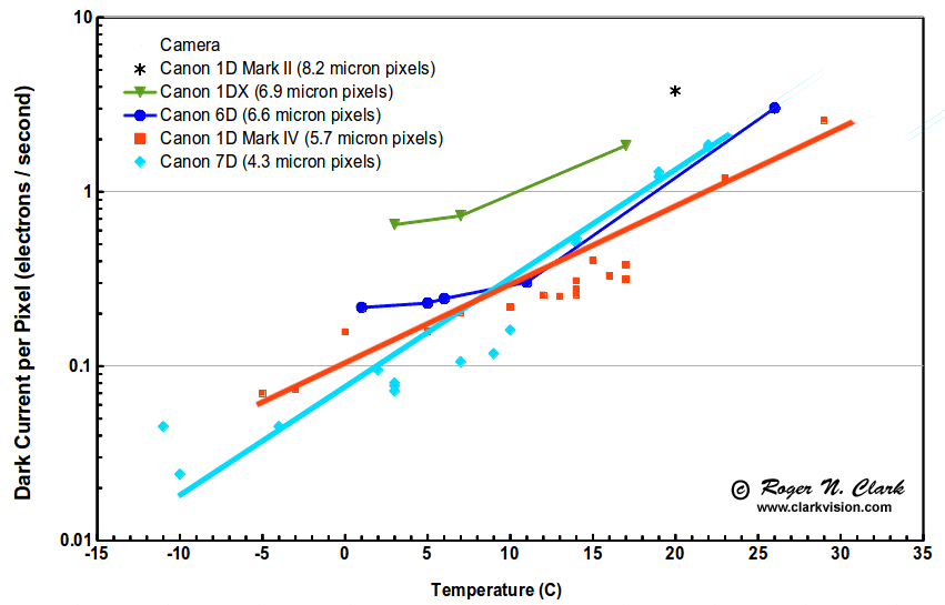 In astrophotography, a high Low-Light Sensitivity Factor would record the most faint stars, at least for exposures where thermal noise did not dominate. However, this low light sensitivity factor does not apply to stars. And if not stars, then not other subjects. For example, stars in the focal plane are small disks, spread by diffraction, atmospheric turbulence, and lens aberrations. Thus, spread over several pixels, and more pixels in a camera with smaller pixels. For SUBJECT sensitivity a better metric may be signal density divided by read noise density (see Figure 10). This section will be changed after more testing. Note the 7D in Figure 7 shows a much lower factor than the 1D Mark IV, yet the 7D records stars at least as faint as the 1DIV, and perhaps slightly fainter. See Nightscape Photography with Digital Cameras for example images that prove this. A contributing factor in low light long exposure factor is also the detrimental effects of noise from dark current. That too will be factored into a new measure.