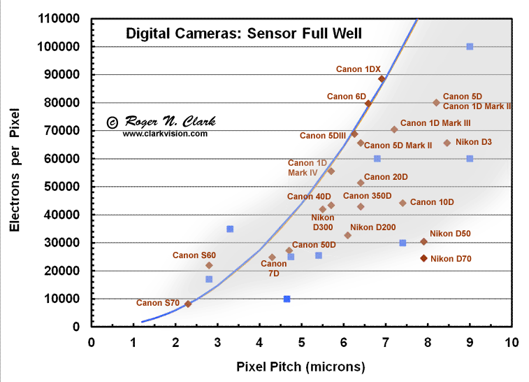 Full well capacity is important for maximum signal-to-noise ratio and dynamic range. Figure 2 shows the signal-to-noise ratio at ISO 100 on an 18% gray card. Eighteen percent is close to the average scene intensity in regular photographs, so Figure 2 shows the typical signal-to-noise ratio in a typical photograph. Dynamic range is shown in Figure 4, and shows a small trend with pixel size. Because this trend scales directly from the square root of the full well capacity and we see the same maturing of technology with recent Canon cameras as we do in Figure 1.
