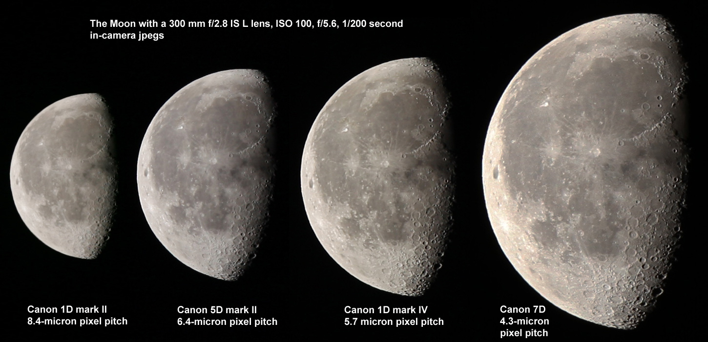 A growing misinterpretation of results like those I present below is that larger pixels are less noisy. The signal-to-noise ratio is dependent on the amount of light collected, and the light collected is delivered by the the lens. It is the lens, it's focal length and the exposure time that determines the amount of light collected. A larger pixel only enables more light to be collected, but at the expense of less detail resolved (given the same focal length lens).