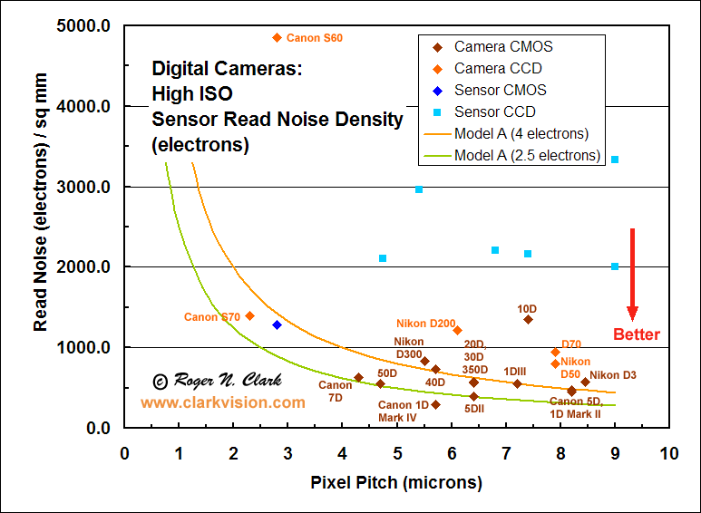 For detecting the lowest signals, read noise is a controlling factor. Read noise is expressed in electrons, and represents a noise floor for low signal detection. For example, if read noise was 10 electrons, and you had only one photon converted in a pixel during an exposure, the signal would mostly be lost in the read noise. (It is possible to see an image where the signal is 1/10 the read noise, where one uses many pixels; see: Night and Low Light Photography with Digital Cameras http://clarkvision.com/articles/night.and.low.light.photography.) Older CCDs tend to have read noise levels in the 15 to 20 or more electrons. Newer CCDs in better cameras tend to run in the 6 to 8 electron range, and some are as low as 3 to 4 electrons. The best CMOS sensors currently have read noise less than 2 electrons and the Canon 1DX shows less than 1 electron at very high ISOs. Figure 3 shows read noise for various cameras and commercially available sensors. One can see that there is no real trend with pixel pitch.