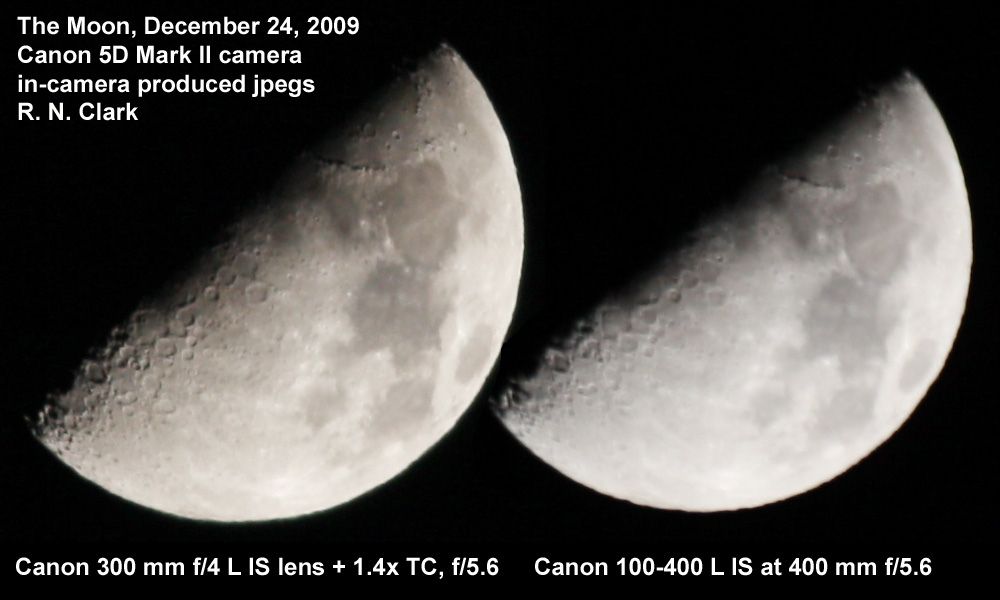 People often choose zoom lenses for their convenience without realizing many zoom lenses are a compromise in image quality. The Canon 100-400 mm L IS lens is very popular with wildlife photographers. There are some indications on the web that there may be some production problems with some copies being better than others. Whether or not that is the case, here are results from my 100-400 versus a 300 mm f/4 L IS lens. In both cases, the moon was imaged on the same tripod with the same camera a few minutes apart using mirror lock-up, cable release (TC-80N3) and IS was off. Exposure was 1/200 second at ISO 200, f/5.6. Neither lens had any filters on the front.