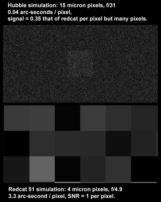 Some people are obsessed with light per pixel and would choose a faster f-ratio or camera with larger pixels to get more light per pixel. Using the data from the 105 and 300 mm lenses, The finer resolution of the 300 mm lens produces a better image at full resolution than the 105 mm lens (Figure 8d) despite having about 9x less light per pixel. The 105 mm f/1.4 image with a 75 mm aperture shows stars to about magnitude 14. The 300 mm f/4 image with a 75 mm aperture shows stars to about magnitude 15.5. This is because the longer focal length for the same aperture spreads the sky background out more, reducing noise from the sky background, and in this case by about square root 9, or 3x. A 3x reduction in noise means fainter stars by more than one magnitude can be detected. Add to the fact that the f/4 lens produces better star images than the f/1.4 lens, then the gain is about 1.5 magnitudes! For the same aperture area, the longer focal length can produce better images, than a shorter focal length faster f-ratio of the same aperture. Similarly, smaller pixels can produce better images than larger pixels even with less light per pixel, because one has many more pixels on objects in the scene. The longer focal length also shows fainter stars.