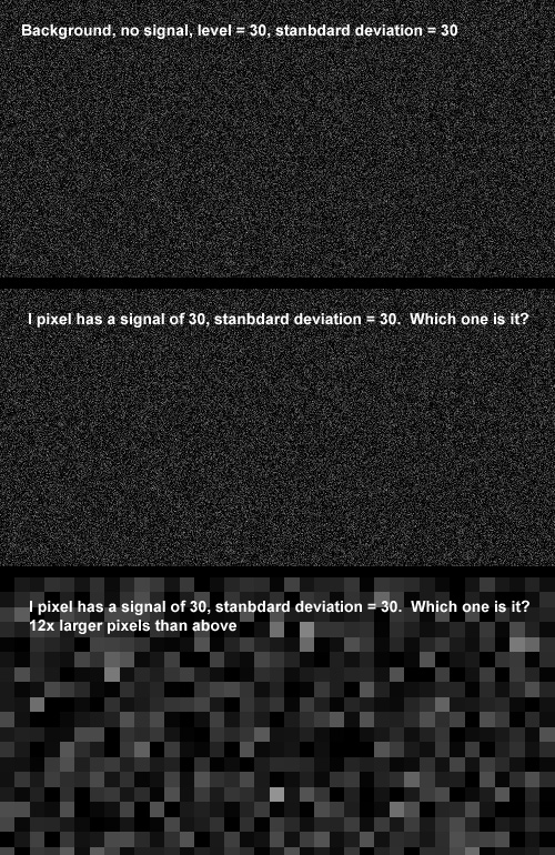 The Apple Pie Analogy and what this all means. Let's consider making an apple pie. Should we use a large pie dish, or a small one (analogy to a large sensor or a small sensor)? Well, it really depends on how much pie filling we have (analogy of how much light we can collect). If we have a large dish and a small amount of pie filing, the pie will be very thin (analogy for large versus small camera sensors). And whether we have a big dish or a little one, for a fixed amount of pie filling if we need to chop up the finished pie into 100 pieces to serve 100 people, each piece will have the same weight and everyone will get the same amount of pie filling. (Analogy to large versus small pixels.) The way to get more pie filling is to get more apples and other ingredients. In photography, the ingredient is light. To collect more light there are 3 ways for a given system efficiency: 1) increase exposure time but that might show blur due to movement of the subject(s), 2) increase the aperture diameter (but that might decrease the depth of field, and/or 3) change distance (but that changes composition and perspective). For a given location, only 1 and 2 change the light collection from objects in the scene. The more light you collect, the finer you can chop up the image to show finer detail, and that is controlled by 1 and 2. Often one can't change distance, e.g. on the edge of a cliff, or safety getting too close to wildlife, or scaring the subject. In portrait photography getting too close distorts faces, like making a nose look too big. And another pie analogy: say you only have little dishes and a lot of pie filling. Simple: make multiple pies, and in the photography world, that would be make a mosaic.